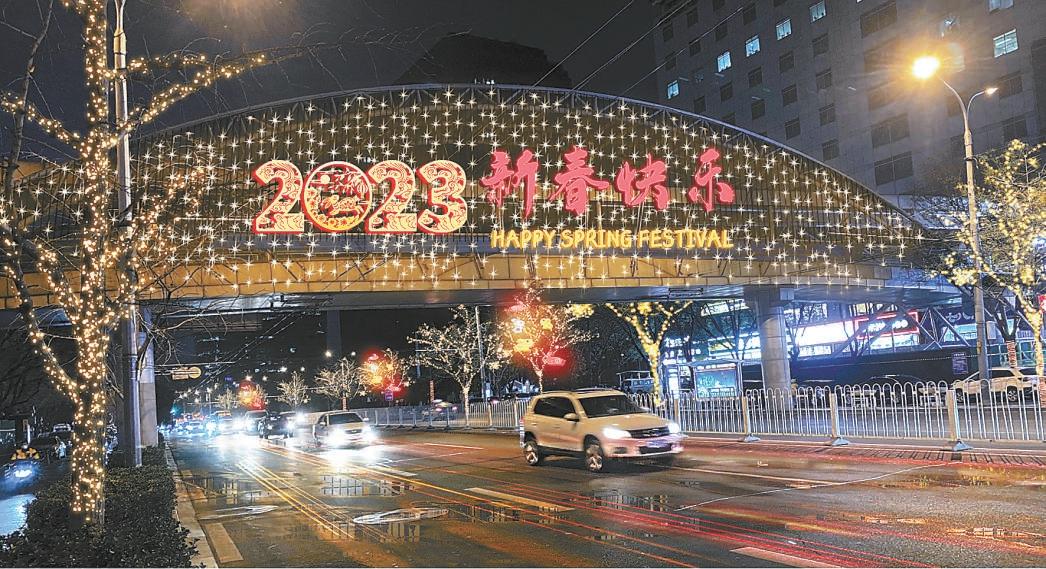 朝陽區(qū)對(duì)多條道路及30座天橋進(jìn)行了夜景裝飾,營造春節(jié)喜慶氣氛(記者程功攝)