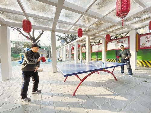 2月22日一早,團結里社區(qū)小廣場上,63歲的市民蔣艷麗和鄰居在球臺上打起乒乓球。