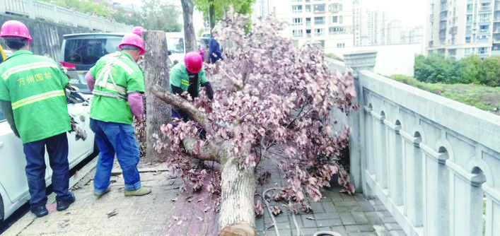園林工人及時(shí)清理樹(shù)枝和樹(shù)葉。