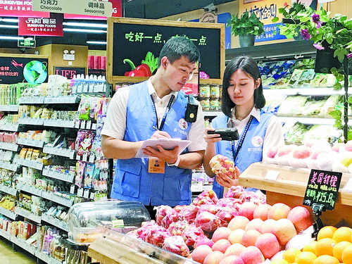 檢驗(yàn)人員對(duì)商超銷售的果蔬進(jìn)行抽檢。