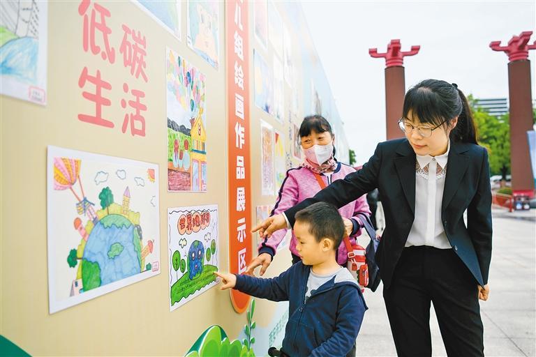 上午9時許,記者看到,設立在活動現(xiàn)場的生態(tài)文明建設成效主題展板吸引市民紛紛駐足圍觀。另一側的巨大圖畫墻上,集中展示著由100名小朋友親手繪制的環(huán)保作品,用兒童的視角傳遞著環(huán)保理念。