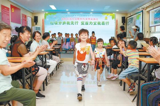 在北京市順義區(qū)勝利街道龍府花園社區(qū)新時(shí)代文明實(shí)踐站內(nèi),一場社區(qū)居民和小朋友共同參與的“垃圾分類我先行 變廢為寶我最行”活動(dòng)日前舉行。孩子們在社區(qū)志愿者的幫助下,利用可回收物制作環(huán)保服裝并T臺秀,創(chuàng)作環(huán)保主題手工、繪畫,在趣味活動(dòng)中提升居民環(huán)保理念,普及生活垃圾分類知識。記者 武亦彬 攝