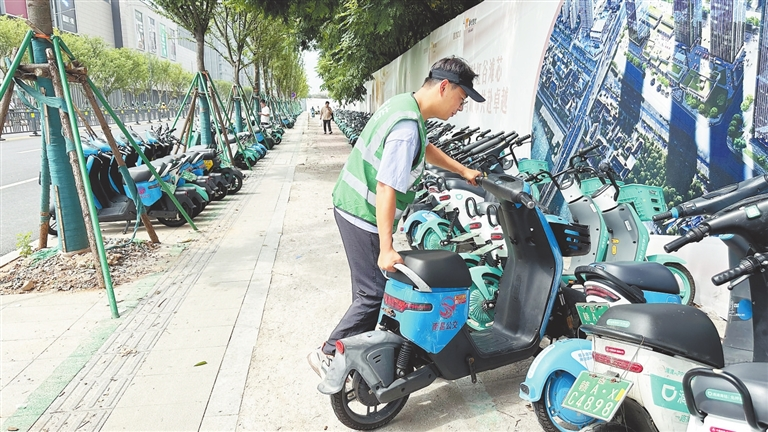 7月20日,南昌市紅谷灘區(qū)萬象路上,早高峰剛過不久,一名穿著綠色馬甲的共享電單車運(yùn)維人員便忙活開了。與以往不同的是,在他整理的車輛中,不僅有綠色的“自家”車輛,還有藍(lán)色、黃色的“別家”車輛。一個(gè)小時(shí)后,100多輛品牌各異的共享電單車便整整齊齊地停放好了。