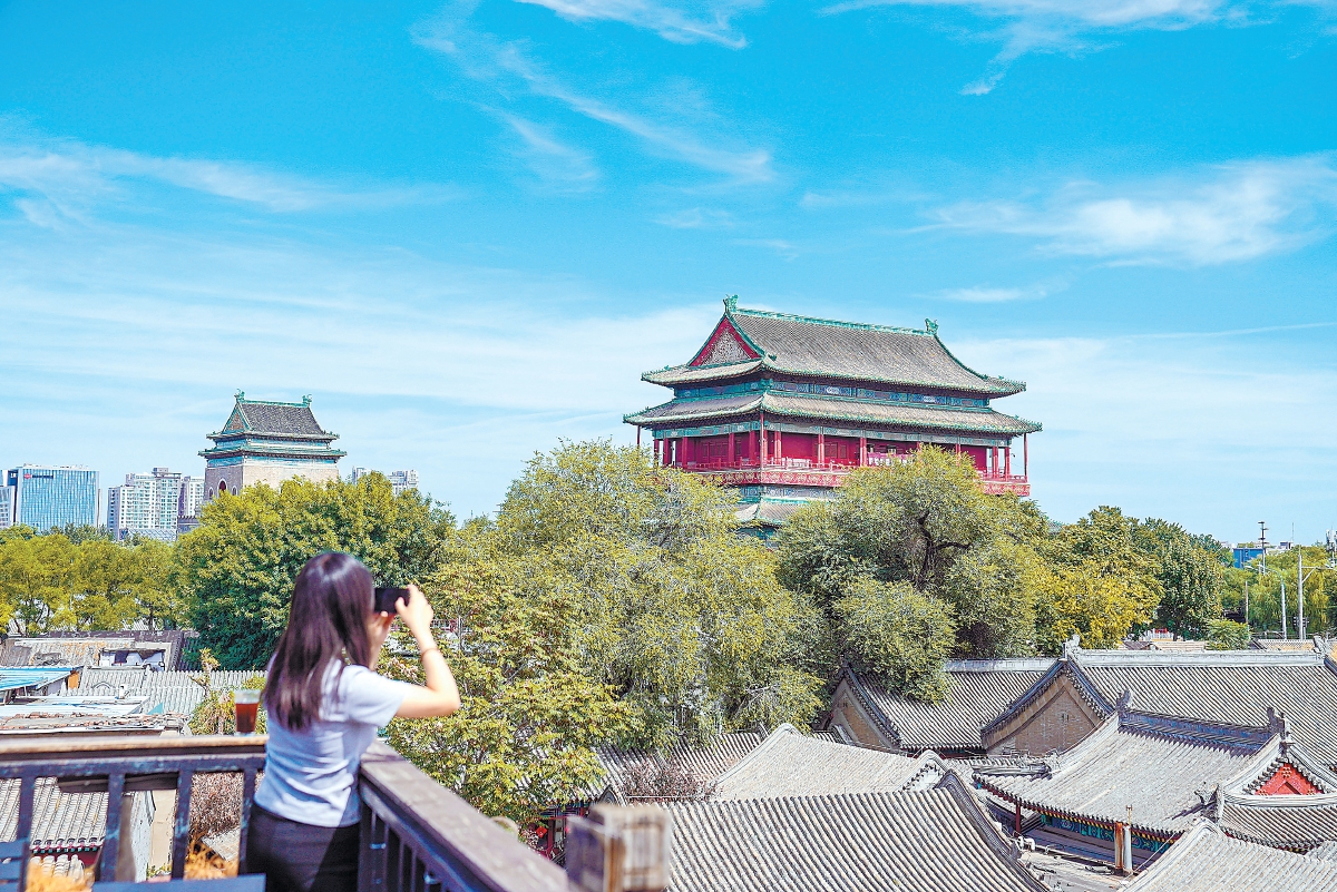 初秋,站在鼓樓底下抬頭看,云卷云舒,紅墻灰瓦,重檐屋頂?shù)木G琉璃剪邊在藍(lán)天下閃閃發(fā)亮。鼓樓內(nèi),一場數(shù)字沉浸展,讓600多歲的古建獲“新生”;隆隆鼓聲,穿過紅墻,伴著悠悠鴿哨;鼓樓外,三岔路口,107路公交緩緩駛過,拍照打卡的游人絡(luò)繹不絕……