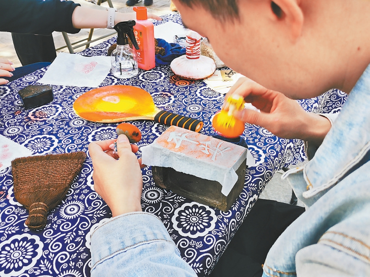 國(guó)慶期間,游客在八大處公園舉辦的活動(dòng)中體驗(yàn)非遺傳承技藝拓印。記者 吳鏑 攝