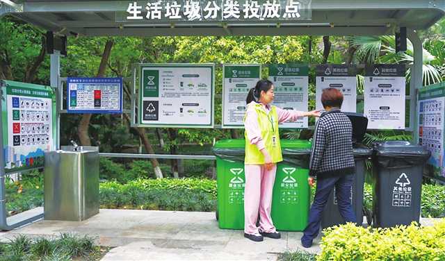 垃圾分類工作人員開展分類指導工作,引導居民正確投放
