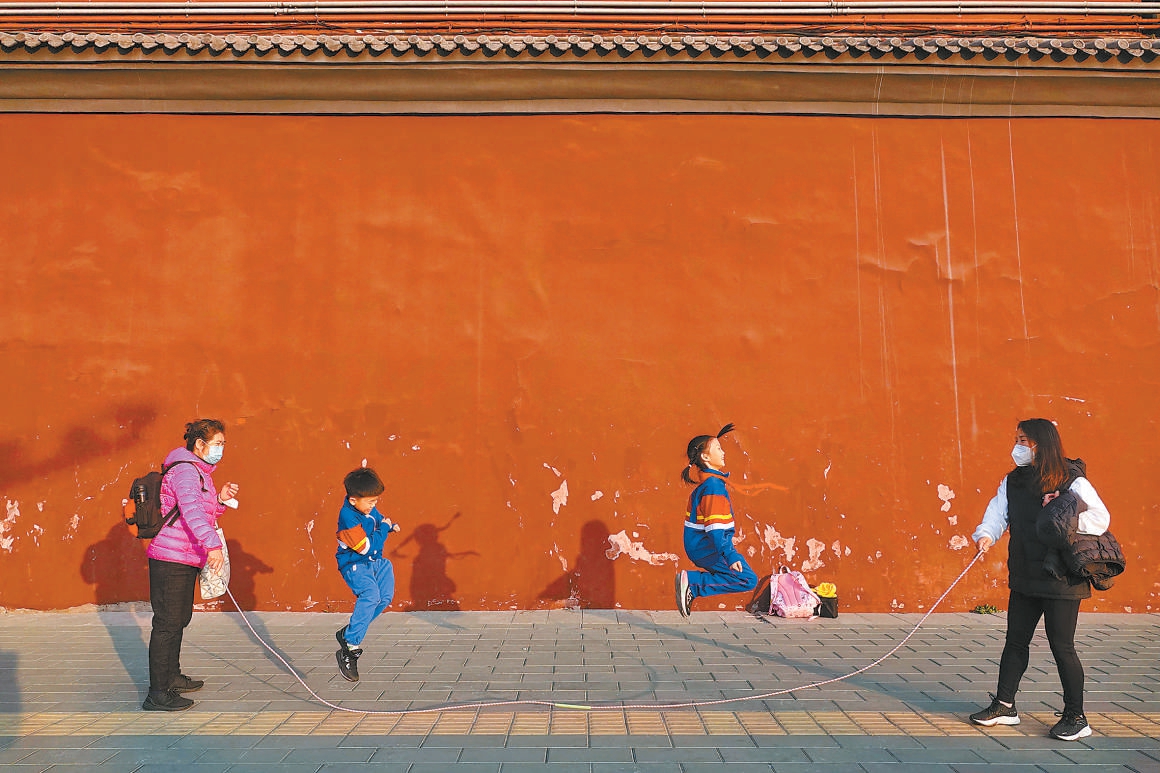 雍和宮古老的紅墻下,剛剛放學(xué)的孩子們在冬日暖陽下快樂地跳繩。 楊建國攝