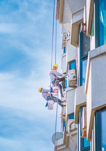 朝陽區(qū)將臺西路芳園里,工人們正在忙著為高樓“刷身洗臉”,守護(hù)美麗家園。劉玉松 攝