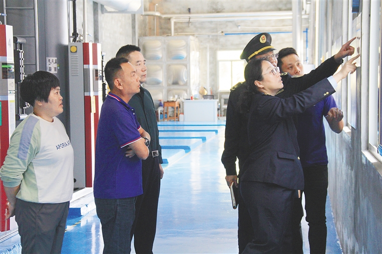 陽光照進(jìn)鍋爐房?jī)?nèi),身穿藍(lán)色工服的工人做著日常維護(hù),瓊海市綜合行政執(zhí)法局工作人員在開展檢查。
