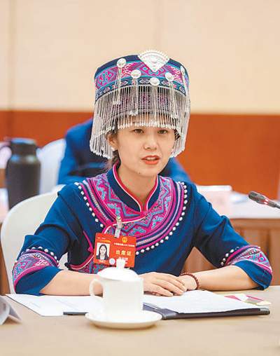 湖北代表團全體會議上,張瓊麗代表發(fā)言。人民網(wǎng)記者 翁奇羽 攝