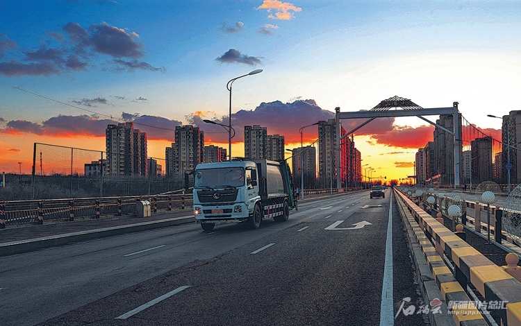 4月5日,落日余暉下,王秋云駕駛著清運(yùn)車(chē)行駛在烏魯木齊經(jīng)濟(jì)技術(shù)開(kāi)發(fā)區(qū)(頭屯河區(qū))金風(fēng)大橋上。