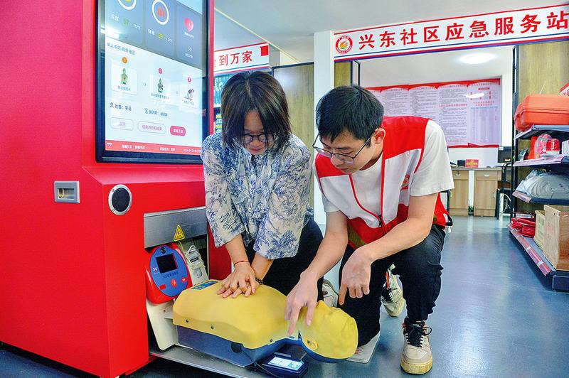 在興東社區(qū)應(yīng)急服務(wù)站,廣西安全生產(chǎn)科學(xué)研究院的工作人員利用心肺復(fù)蘇急救培訓(xùn)一體機(jī)開展示范教學(xué),并邀請(qǐng)居民實(shí)操訓(xùn)練。記者 黃維業(yè) 攝