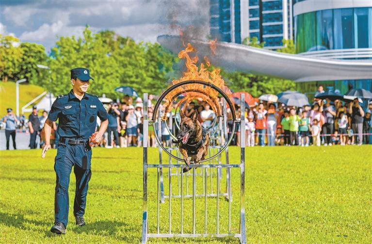 民警向市民展示警犬訓(xùn)練。記者 畢晗 通訊員 藍(lán)東鴻 攝