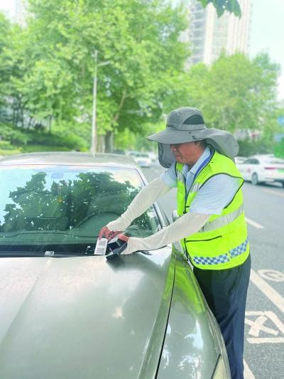 7月31日,南京最高氣溫又輕松越過了38℃,下午3時后,盡管氣溫開始掉頭向下,但馬路上還是熱浪翻滾,三牌樓大街停車收費員曹文磊仍如平時一樣耐心地指揮著每一位停車人,“方向盤向右打死,掛倒擋,走……”曹文磊手、嘴并用,烈日下的他滿臉通紅、大汗淋漓。當車輛按方向停進泊位內后,他隨即拿出打單機、車輛信息系統(tǒng)錄入機進行停車收費的相關操作,邊操作邊眼看四方,“那邊又有一輛車來了?!彼杆仝s過去進行打單、拍照等一系列同樣操作。