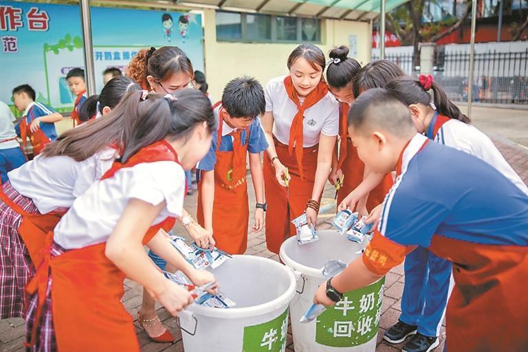 在垃圾分類的可回收物中,校園奶盒回收價值低,深圳進(jìn)一步探索建立低值可回收物回收鏈路。2021年9月,深圳市將垃圾分類與校園實踐教育相結(jié)合,發(fā)起校園奶盒資源回收行動。