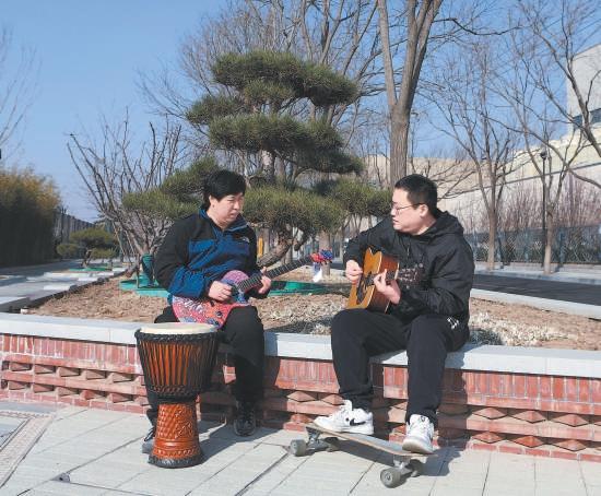 兩位音樂愛好者在臺湖舞美藝術(shù)中心口袋公園內(nèi)彈奏樂器。聶堂明攝