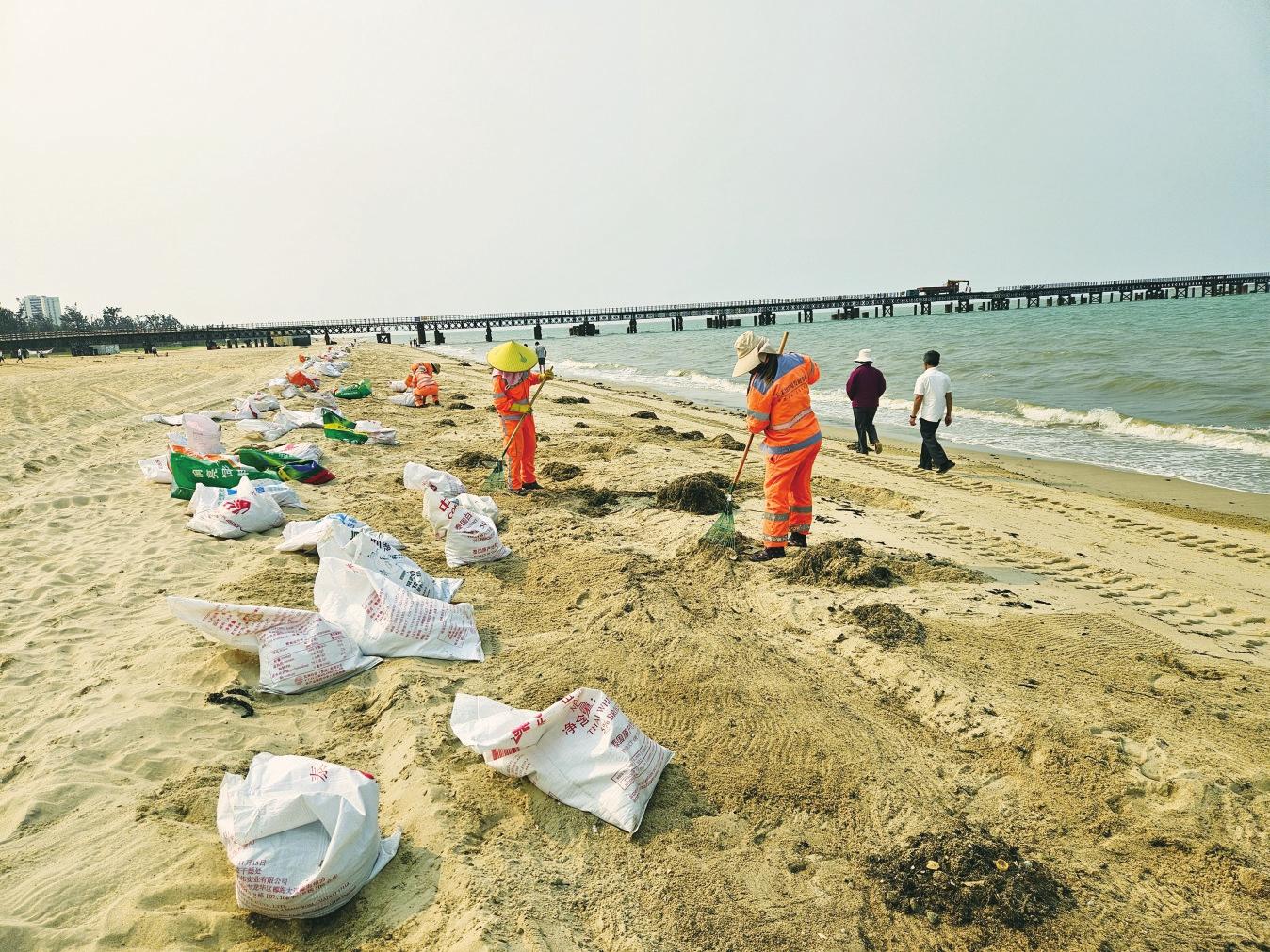 在西海岸的沙灘上,??谟窈烫锕镜沫h(huán)衛(wèi)工人們忙碌的身影成了一道亮麗的風(fēng)景線(xiàn)。他們沿著海岸線(xiàn)行走,一旦發(fā)現(xiàn)垃圾便立即夾起放入垃圾袋中,確保沙灘的清潔。同時(shí),近海海域的打撈船上,打撈員們也正忙著用長(zhǎng)長(zhǎng)的打撈桿打撈海面上的垃圾,維護(hù)海洋的清潔與美麗……??谟窈烫锕窘⒌摹昂j懣铡比灰惑w海上環(huán)衛(wèi)作業(yè)體系,環(huán)衛(wèi)工人、機(jī)械車(chē)輛、打撈船以及無(wú)人機(jī)的協(xié)作,形成了完整的打撈、收集、運(yùn)輸、處理閉環(huán)鏈條,為環(huán)境的干凈整潔提供了有力保障,確保了海上環(huán)境的清潔。
