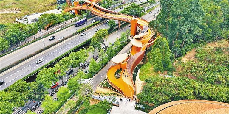 在目前深圳占地面積最大的兒童公園——龍崗兒童公園,門口飄來一條靚麗“彩帶”。這座人行天橋是公園的配套連接通道,橫跨公園門口的主干道鹽龍大道,將公園與周邊的商圈連通起來,實(shí)現(xiàn)“無縫”連接。帶著孩子到公園玩的胡先生表示,以前從商圈到公園需要等紅綠燈,過街時(shí)人群也比較雜亂,如今有了天橋,可以輕松到達(dá)公園門口,這么漂亮的天橋孩子們也很是喜歡。
