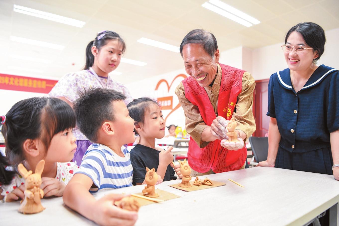 ??诃偵絽^(qū)文化館內(nèi),海南省非物質(zhì)文化遺產(chǎn)代表性項(xiàng)目龍?zhí)恋?/span>刻藝術(shù)代表性傳承人王科美(右2)指導(dǎo)小朋友制作泥雕。記者 蘇弼坤 攝