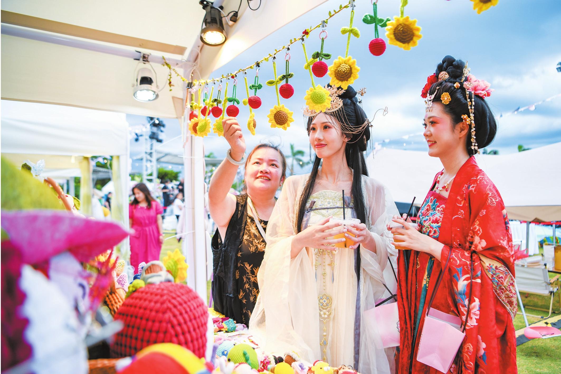 身穿傳統(tǒng)服飾的市民在2025椰城香見·海口火山荔枝夏日市集上購物,臉上洋溢著幸福的笑容。記者 蘇弼坤 攝