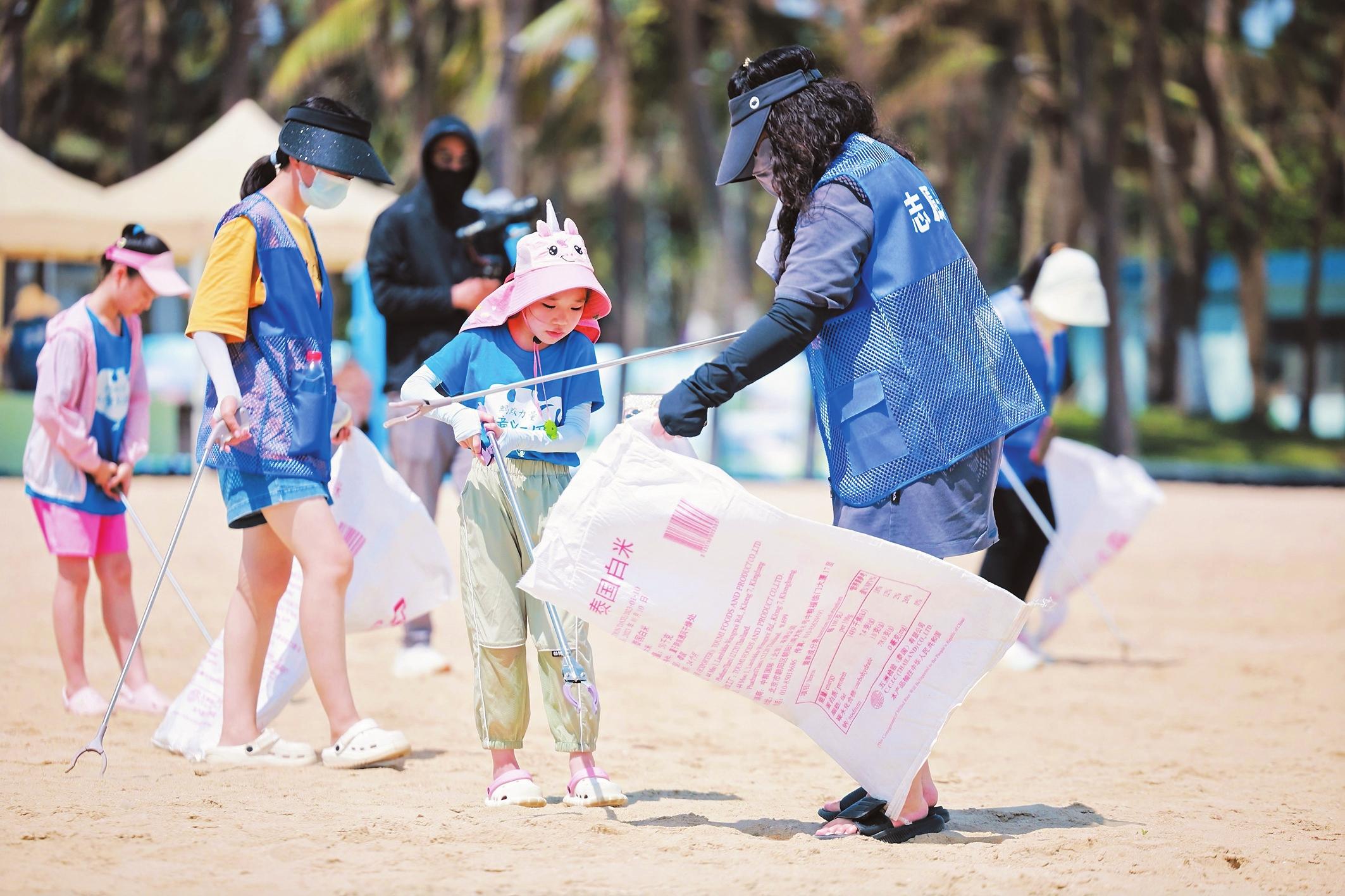志愿者在??诩偃蘸┌毒€上收集垃圾,清潔海灘,志愿者的自覺行為,刷新著城市文明的觀感。記者 孫士杰 攝