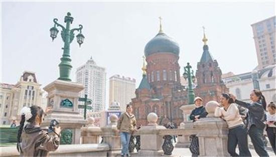 黑龍江省哈爾濱市,游客在索菲亞教堂附近游玩。哈爾濱市有“萬國建筑博物館”的美譽,當?shù)赝诰驓v史底蘊,塑造城市發(fā)展新高度。新華社記者 謝劍飛攝