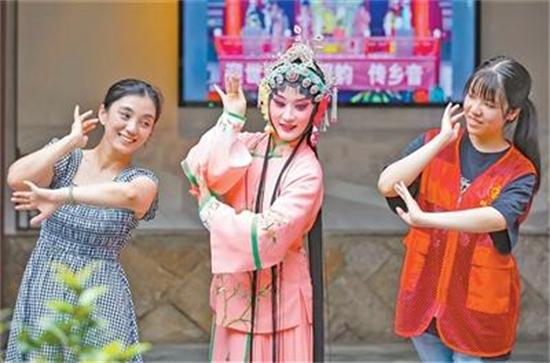 福建省福州市鼓樓區(qū)安泰街道綜合文化站,閩劇演員(中)教授表演技藝。當?shù)赝苿印肮咆?非遺+展演”等多元化發(fā)展,有效傳播閩都“?!蔽幕?,構(gòu)建“15分鐘幸福生活圈”,讓市民和游客感受非遺之美。謝貴明攝(人民視覺)