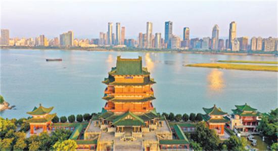 “落霞與孤鶩齊飛,秋水共長天一色?!苯魇∧喜须蹰w景區(qū)改造升級,一江兩岸風景如畫。新華社記者 劉金海攝