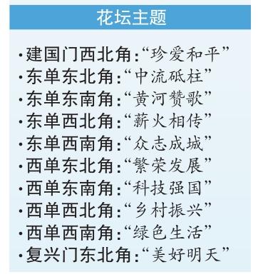 本次長安街沿線布置的立體花壇共10組,東至建國門,西到復(fù)興門,東單、西單路口各布置4組。東單路口4組花壇圍繞銘記歷史、紀(jì)念抗戰(zhàn)勝利主題;西單路口4組花壇展現(xiàn)祖國繁榮、人民幸福場(chǎng)景。其中,東單東北角“中流砥柱”花壇頂高最高,達(dá)10.9米。