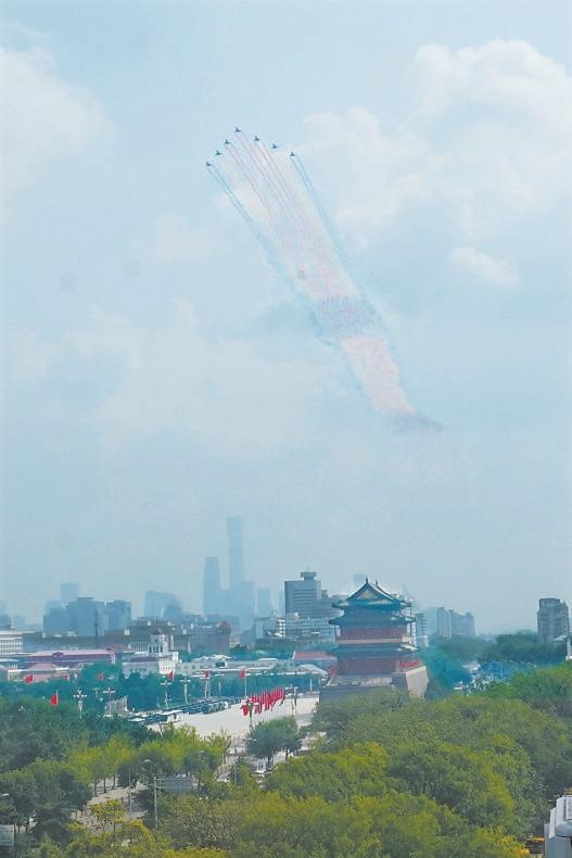 戰(zhàn)機(jī)編隊拉出的彩煙與中軸線上的古都風(fēng)貌交相輝映。趙瑞 攝