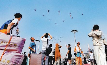 北京站前廣場旅客駐足觀看直升機(jī)梯隊。記者 安旭東 攝