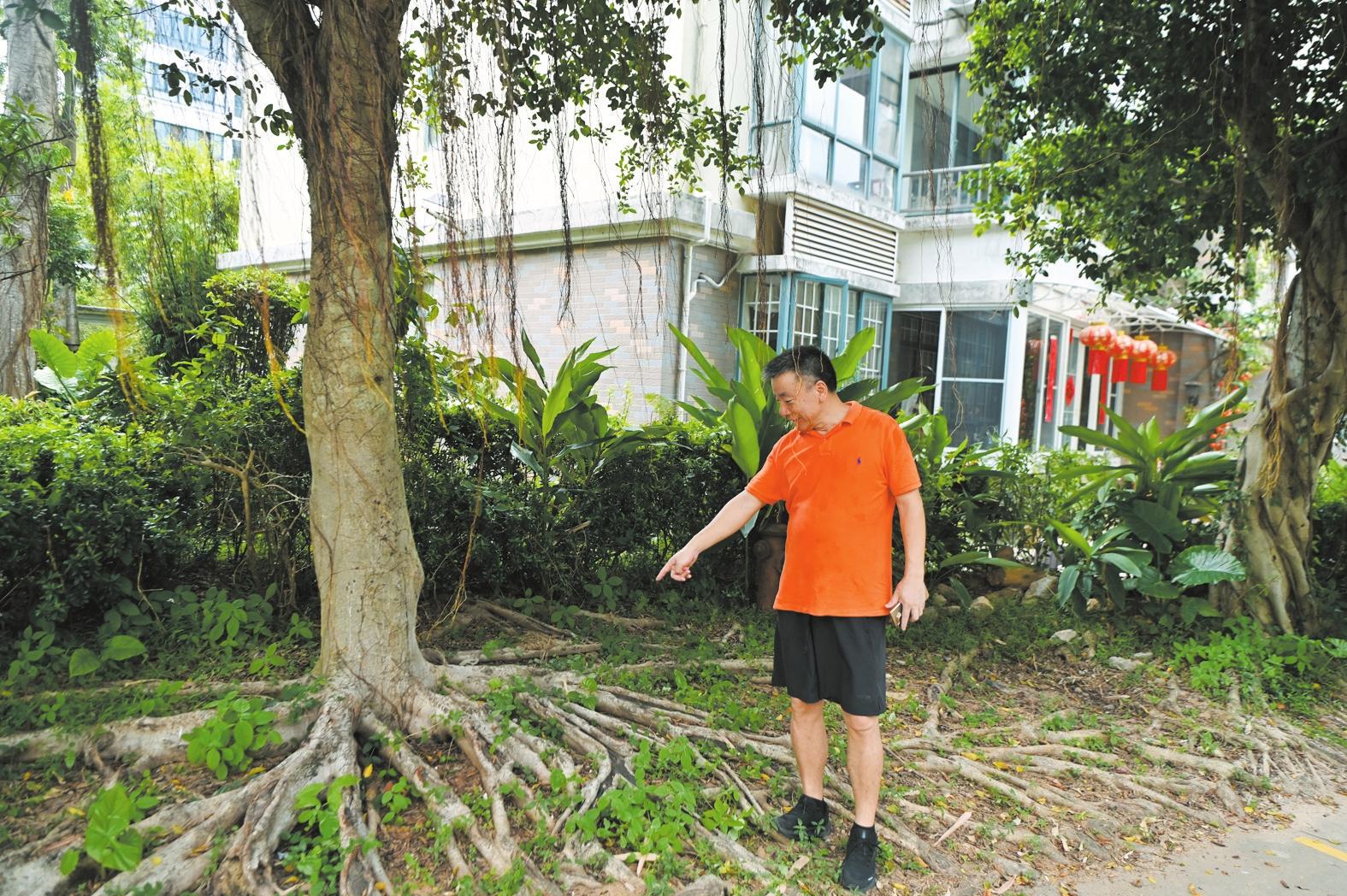 觀瀾公寓小區(qū)13A棟業(yè)主顏先生向記者講述榕樹根系帶來的煩惱。記者 石中華 攝