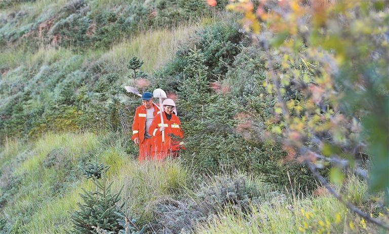 “以前哪能看到這么多植物?”西山林場尖哇嘴管護員魯生錄和老伴兒李四讓卓瑪扛著鐵鍬,沿著管護區(qū)的小道巡護,望著遠處連綿的山坡,眼里滿是回憶:“聽老一輩綠化人說,剛開始種樹的時候,山上盡是光禿禿的土坡,風一吹就揚沙,能活下來的只有幾棵耐旱的老楊樹。后來為了讓林子‘活’起來,大家想盡了辦法——從外地引種云杉、沙棘這些耐高原氣候的樹種,先在育苗區(qū)試種,觀察它們的長勢,再慢慢摸索不同樹種‘搭伴生長’的規(guī)律。你看現(xiàn)在,喬木能擋風固土,灌木能涵養(yǎng)水分,各種鳥類都來這兒筑巢了。”