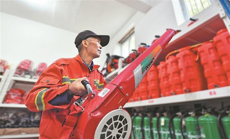 守護這片綠,防火是全年不能松的“弦”。園區(qū)的防火通道旁,紅色的滅火器箱沿路邊排放整齊。在森林防火物資儲備庫里,管護員趙金財一邊對設(shè)備進行維護,一邊說道:“林子密了,一點火星都可能出大事。一到干燥季節(jié),我們每天要繞著園區(qū)走好幾圈,見著游客抽煙就上前宣教,遇到枯枝落葉也及時清走。這些樹長了十幾年才這么粗,我們多上點心,才能守住這片綠?!?/p>