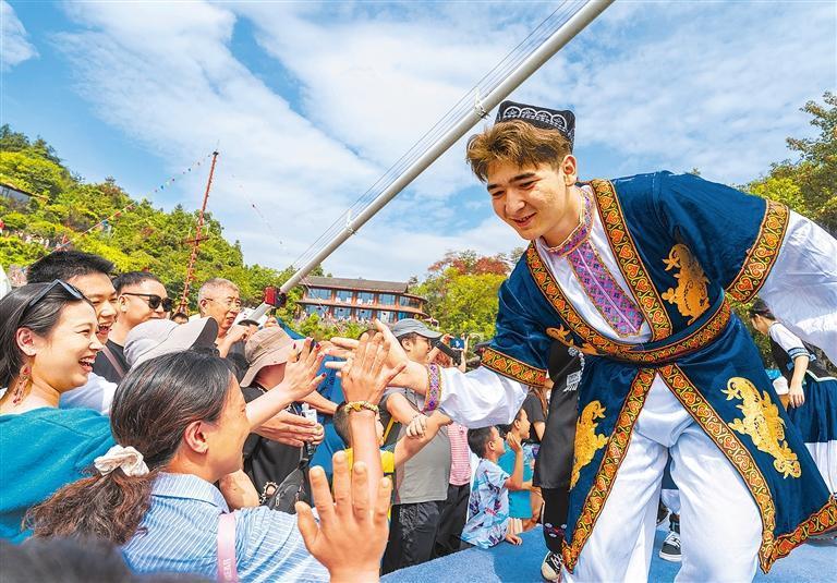 10月3日,湖南省吉首市矮寨大橋景區(qū)上演“56個民族風情盛會”,演員與游客互動,現(xiàn)場十分熱鬧。梁永鴻攝(中經視覺)