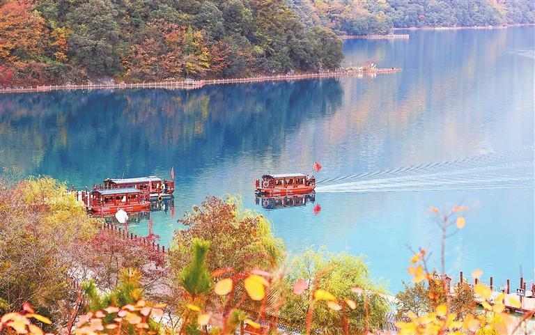 初冬時(shí)節(jié),甘肅省隴南市文縣天池國(guó)家森林公園層林盡染、碧波如鏡,吸引游客前來(lái)賞景游玩。通訊員 后斌玉