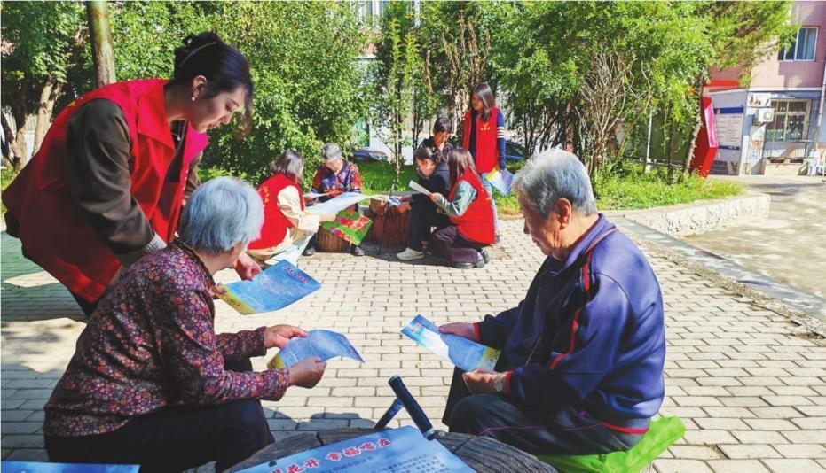 喀左縣志愿者向居民宣傳城市文明建設(shè)常識(shí)。 李娜 攝