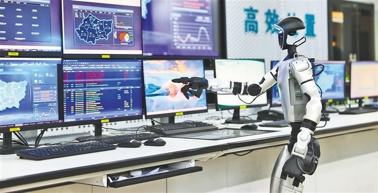 位于湖北省襄陽(yáng)市的國(guó)網(wǎng)襄陽(yáng)供電公司江北集控站監(jiān)控大廳內(nèi),人形機(jī)器人專(zhuān)注“盯屏”。它能自動(dòng)生成故障處置建議,遇到緊急情況還能自主撥打通知電話(huà),讓事故分析從15分鐘縮短到秒級(jí),故障處置準(zhǔn)確率提升70%以上。王虎攝(中經(jīng)視覺(jué))