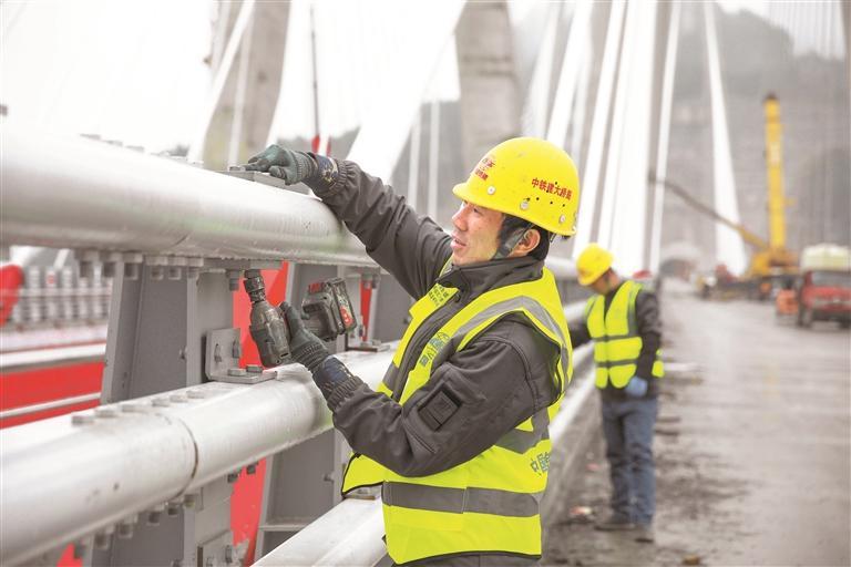 1月1日,工人在修文縣境內(nèi)的烏長高速公路金旗特大橋項(xiàng)目建設(shè)現(xiàn)場有序作業(yè)。 袁福洪 攝 (影像貴州)