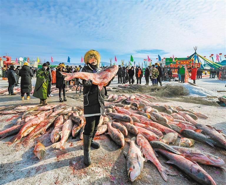 2023年2月16日拍攝的“鏡泊湖冬捕節(jié)”現(xiàn)場。當(dāng)?shù)匕讯都净顒哟蛟斐赏苿颖┞糜伟l(fā)展的重要品牌。 唐偉東攝(中經(jīng)視覺)