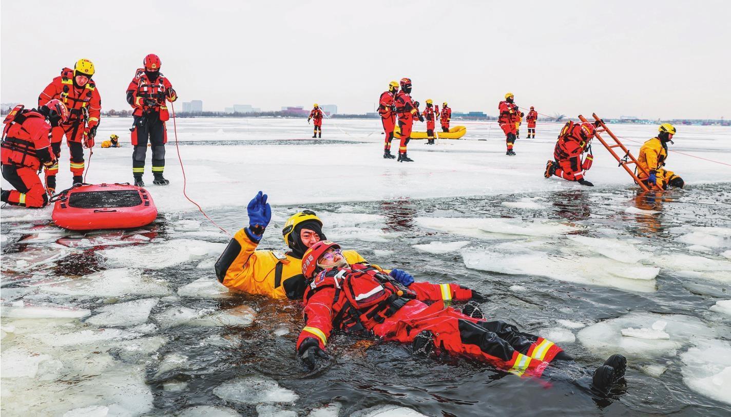 圖為消防救援人員正在開(kāi)展冰上救援訓(xùn)練。(記者 趙敬東 攝)