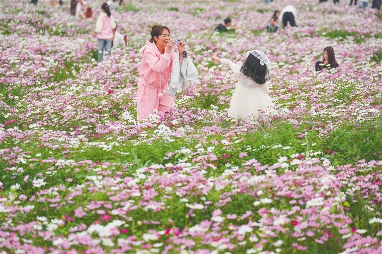 1月30日,位于海口美蘭區(qū)瓊山大道的海南國際花卉產(chǎn)業(yè)園,大片格桑花迎冬綻放。色彩繽紛的格桑花海,吸引眾多市民游客前來打卡拍照。記者 李天平 攝