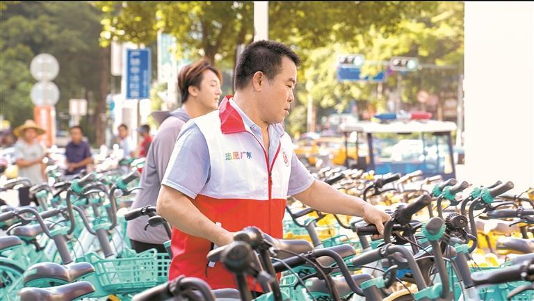 志愿者將共享單車擺放到指定區(qū)域。
