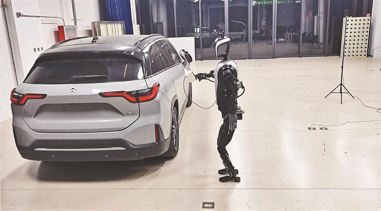 樂(lè)聚夸父人形機(jī)器人在測(cè)試場(chǎng)景中為車輛充電。
