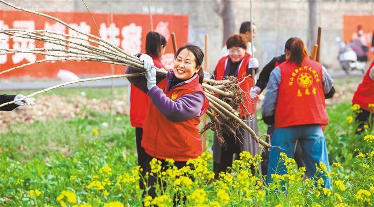 3月11日,河南省焦作市博愛縣柏山鎮(zhèn)大中里村,志愿者在搬運樹苗,準備種植。程全攝(中經視覺)
