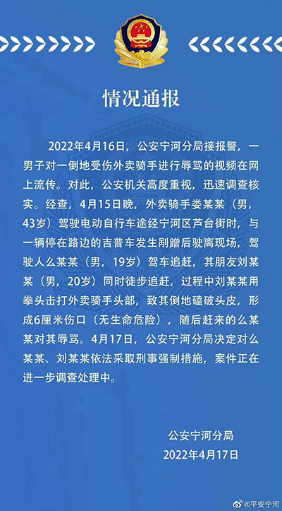 4月17日,天津市公安局寧河公安分局發(fā)布情況通報(bào)。通報(bào)中指出,4月16日,寧河公安分局接報(bào)警,一男子對(duì)一倒地受傷外賣(mài)騎手進(jìn)行辱罵的視頻在網(wǎng)上流傳。經(jīng)查,4月15日晚,外賣(mài)騎手婁某某駕駛電動(dòng)自行車(chē)途經(jīng)寧河區(qū)蘆臺(tái)街時(shí),與一輛停在路邊的吉普車(chē)發(fā)生剮蹭后駛離現(xiàn)場(chǎng),駕駛?cè)嗣茨衬绸{車(chē)追趕,其朋友劉某某同時(shí)徒步追趕,過(guò)程中劉某某用拳頭擊打外賣(mài)騎手頭部,致其倒地磕破頭皮,形成6厘米傷口(無(wú)生命危險(xiǎn)),隨后趕來(lái)的么某某對(duì)其辱罵。