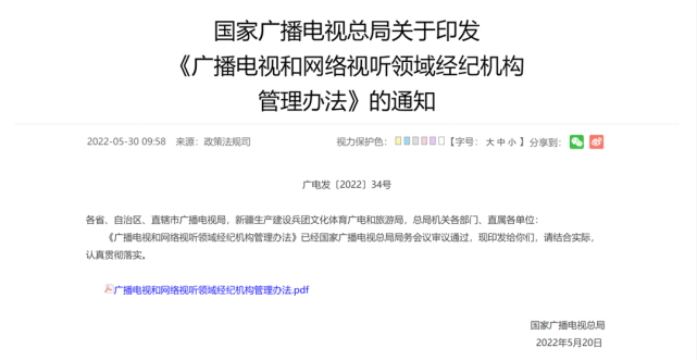 5月30日,國家廣播電視總局印發(fā)了《廣播電視和網(wǎng)絡(luò)視聽領(lǐng)域經(jīng)紀(jì)機構(gòu)管理辦法》(下稱《辦法》)的通知,并要求各省、自治區(qū)、直轄市廣播電視局,新疆生產(chǎn)建設(shè)兵團文化體育廣電和旅游局,總局機關(guān)各部門、直屬各單位結(jié)合實際情況,貫徹落實該管理辦法。