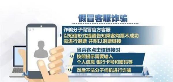 假冒客服詐騙:詐騙分子假冒官方客服以短信形式提醒告知乘客購票不成功,需進(jìn)行退票,并附以退票鏈接。當(dāng)乘客點(diǎn)擊該鏈接時(shí),按照提示需要輸入個(gè)人信息、銀行卡號和密碼等,然后不法分子伺機(jī)進(jìn)行詐騙。