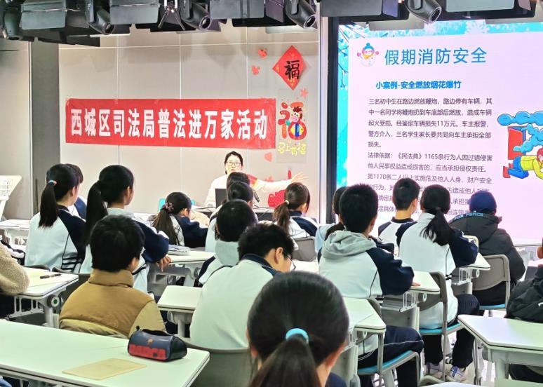 1月23日,北京市西城區(qū)司法局晨夕普法團隊聯(lián)合區(qū)學(xué)生綜合實踐活動中心、北京市第十三中學(xué),舉辦“寒假來臨 安全先行”安全教育普法講座。圖為律師在現(xiàn)場與同學(xué)們積極互動。