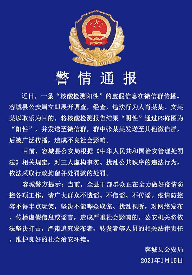 近日,一條“核酸檢測陽性”的虛假信息在雄安新區(qū)容城縣居民微信群中傳播。經(jīng)容城縣公安局調(diào)查,違法行為人肖某某、文某某以取樂為目的,將核酸檢測報(bào)告結(jié)果“陰性”通過軟件修圖為“陽性”,并發(fā)送至微信群,群中張某某發(fā)送至其他微信群,后被廣泛傳播,造成不良社會(huì)影響。